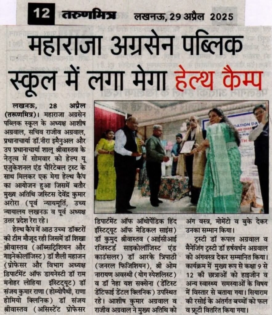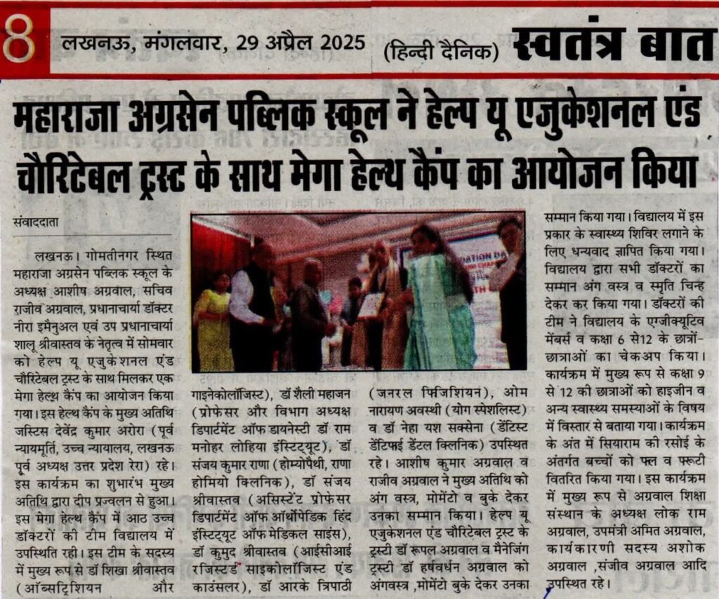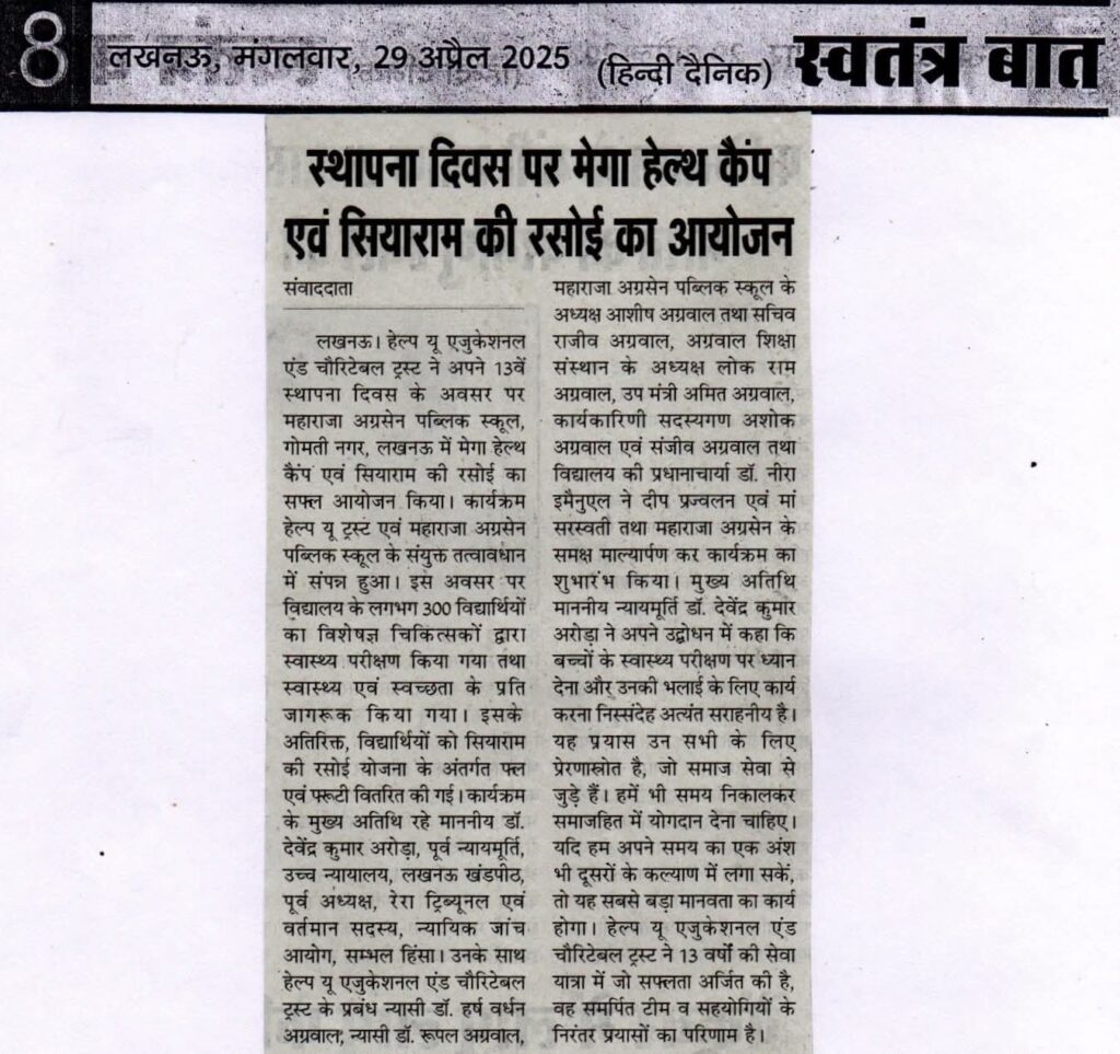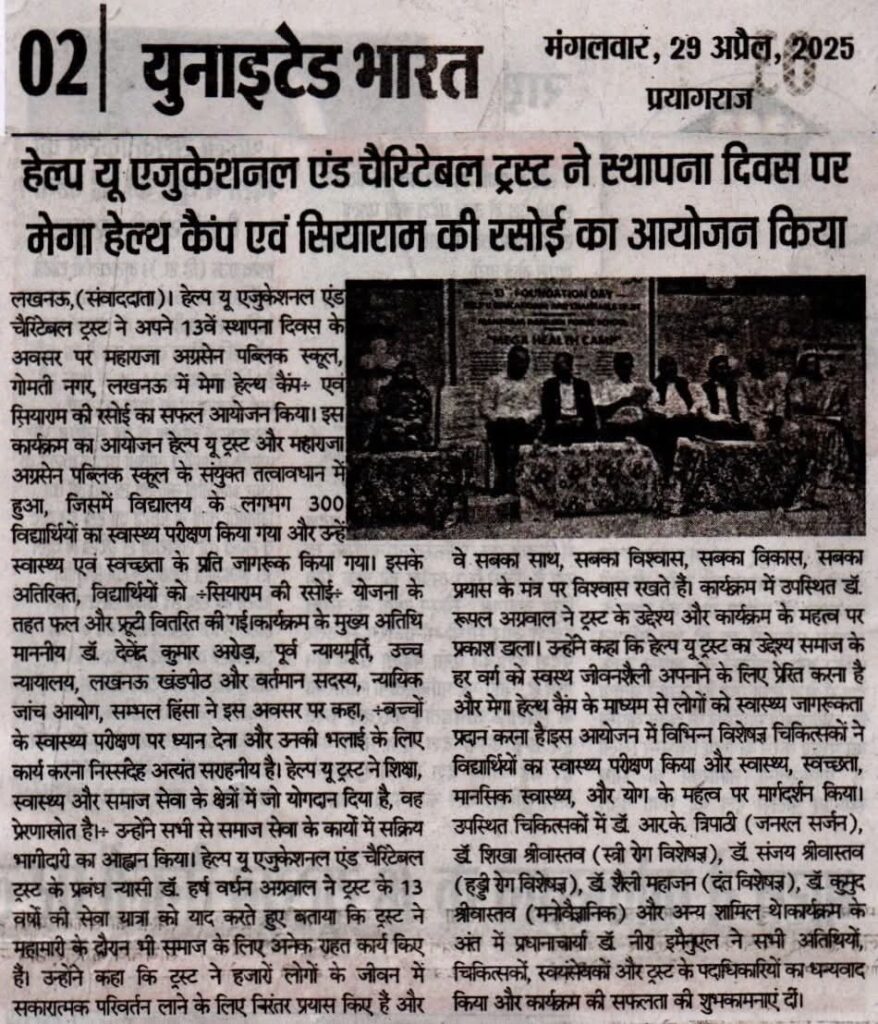 13 वर्ष पहले जब हेल्प यू एजुकेशनल एंड चैरिटेबल ट्रस्ट की नींव रखी गई थी, तो उसका उद्देश्य केवल सेवा करना नहीं था, बल्कि सेवा को समाज की जीवनशैली बनाना था। आज यह सपना हकीकत बन रहा है। अपने 13वें स्थापना दिवस पर ट्रस्ट ने महाराजा अग्रसेन पब्लिक स्कूल, लखनऊ के सहयोग से एक भव्य मेगा हेल्थ कैंप आयोजित किया, जिसमें स्वास्थ्य, शिक्षा और सामाजिक सेवा का अद्भुत संगम देखने को मिला।